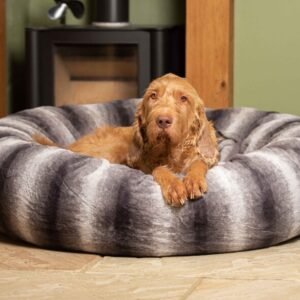 Give your pet the gift of luxury, comfort, and security with this plush grey calming donut dog bed.