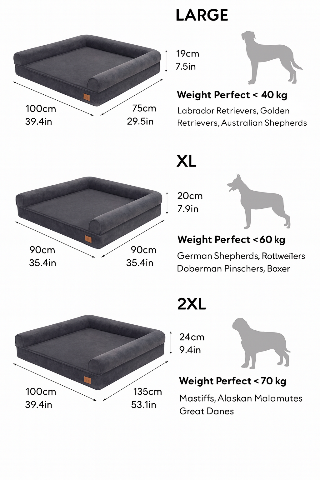 – XL: 120 x 90 x 20 cm (suitable for dogs up to 60kg)